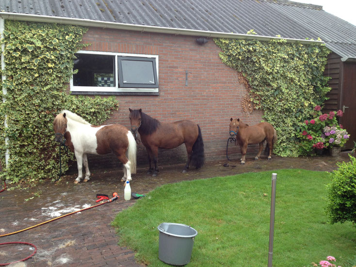 De pony's krijgen twee keer per dag aandacht, 's ochtends en 's avonds. Ze zijn sociaal, ze komen altijd. Ze begroeten je en ' kletsen' tegen je. Ze zijn dol op aandacht en laten zich maar wat